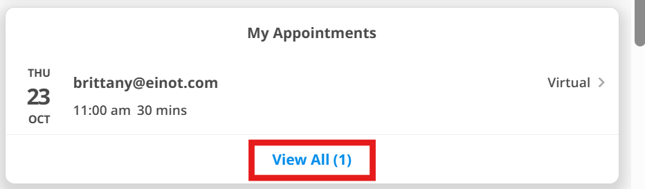 Upcoming appointments can be seen in the "My Appointments" tab from your main menu/Hub. To access your complete Appointment inbox, you can tap on "View All".