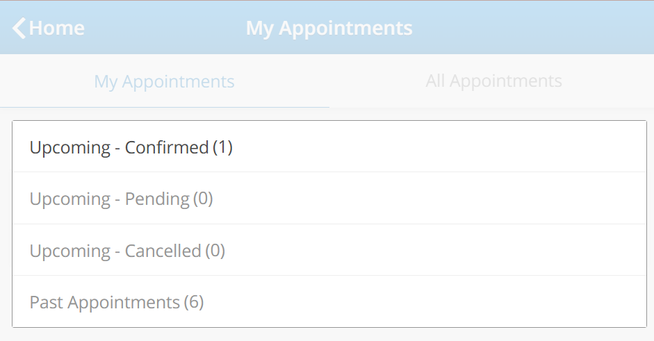 By tapping on the drop-down filter found near the top, you can view your appointments by viewing one of the 3 statuses below:
