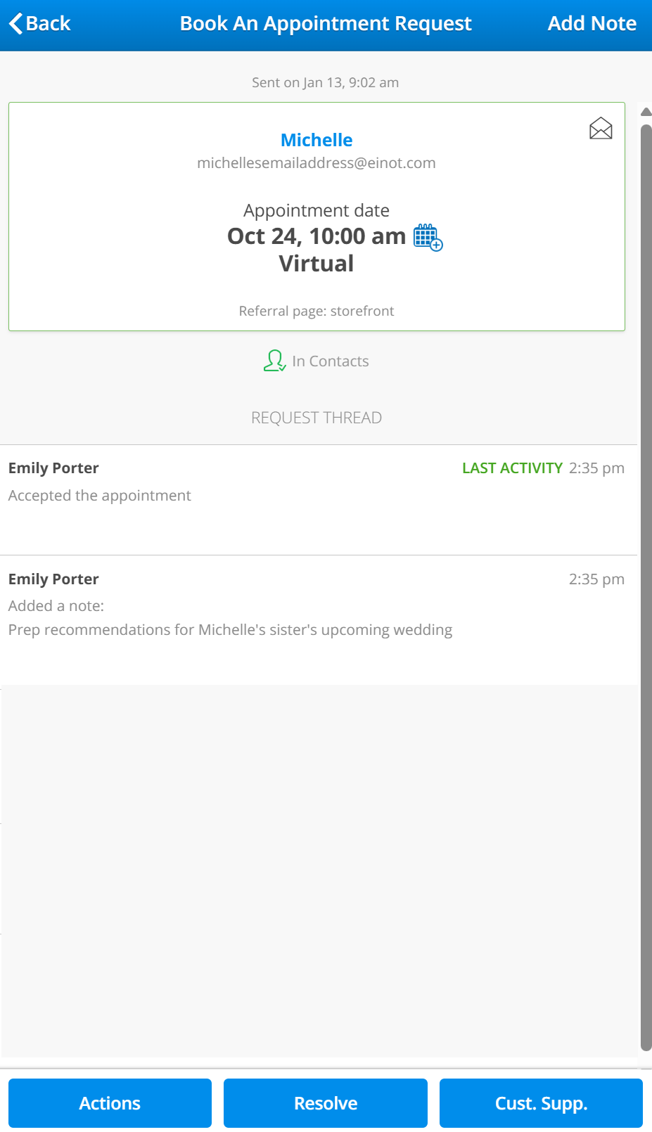 - Resolve: once the appointment has been completed, you can mark it as Resolved to ensure it closes off any open threads.